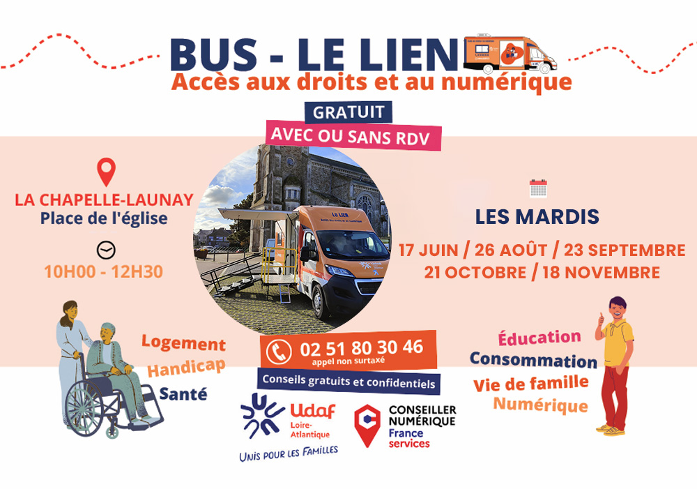 Le Lien - Accès aux droits et au numériqueUn lieu d'information, d'écoute et d'orientation pour répondre à toutes vos questions en lien avec la vie quotidienneParking devant la mairie, un mercredi par mois de 10 h à 12 h 30Publié le 17 octobre 2025 Ouvert aux habitant.e.s de Loire-AtlantiqueAccès PMR PrécédentRetour à la listeSuivant